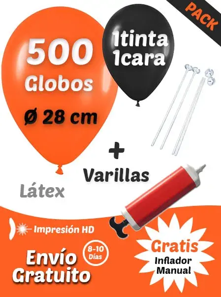 500 Globos Látex Personalizados a 1 cara 1 tinta + 500 Varillas + Inflador Manual | Pack Básico